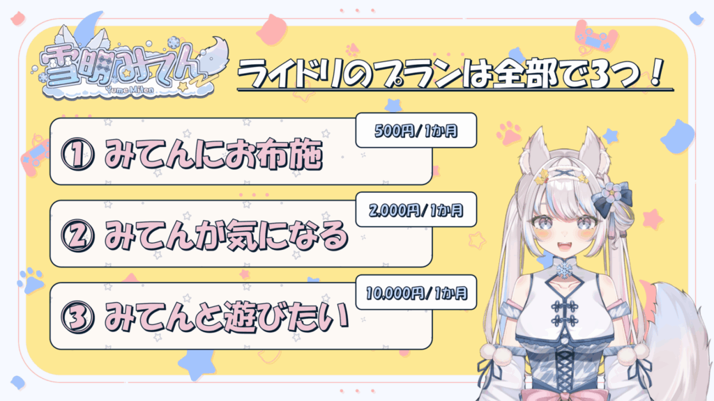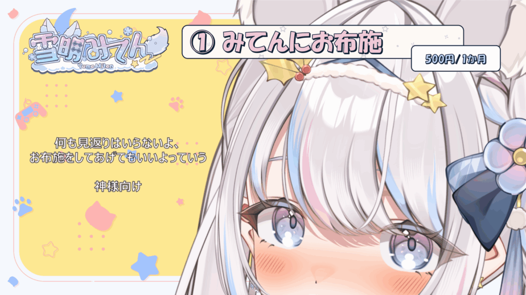 特典はないけど、それでも雪明みてんのことを応援したいという方向けのプランだよ!いつも応援をしていただき、ありがとうございます!